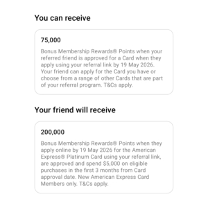 Mate, listen up – this Amex Platinum referral bonus is HUGE right now! You can score an insane 200,000 bonus points just for signing up and hitting the $5k spend, plus the referrer gets 75k points! Considering the card pays for itself with: