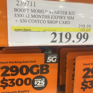 Boost Mobile 290GB 365-Day Plan $220 (Was $300) + $30 Costco Gift Card (In-Store Only) @ Costco (Membership Required)