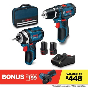 Mate, you HAVE to check out this Bosch 12V kit at Total Tools for just $199—it's an absolute steal! You're basically getting the drill and impact driver for free because the grinder alone usually sells for $199. Seriously, you get the Drill, Impact Driver, AND Grinder for one low price, and the batteries are included too! Grab this deal now before they figure out the pricing error!