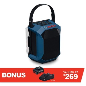 Crank up the tunes on your worksite and power your tools for just $149! You're getting the tough Bosch 18V Mini Bluetooth Speaker (skin only) plus a HUGE bonus Bosch 5.0Ah Battery and Charger starter pack—that's serious value you won't want to miss.