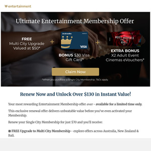 Buy 1-Year Single City Membership for $70, Get Bonus Multi City Upgrade (worth $50), $30 GC & 2 Event Evouchers @ Entertainment
