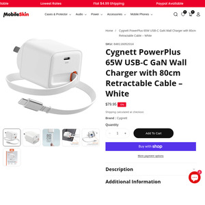 Cygnett PowerPlus 65W USB-C GaN Wall Charger with 80cm Retractable Cable at $49.95 + $4.99 Shipping @Mobileskin