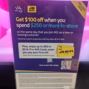 $100 JB Hi-Fi for Signing up to AGL in-Store ($250 minimum spend)