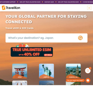 40% OFF Japan (KDDI) | Thailand (True) | South Korea (SKT) | True Unlimited Travel eSIM (No FUP) @ TravelKon