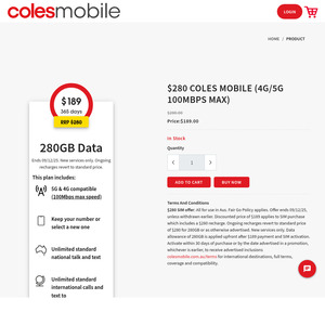 Coles mobile: 365 days pre paid sim card $189 (powered by Optus)