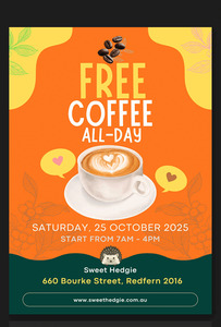 Wake up and smell the savings, Sydney! You're getting a perfectly crafted, FREE coffee this Saturday, October 25th, thanks to our barista legend, Andy, at Sweet Hedgie in Redfern.