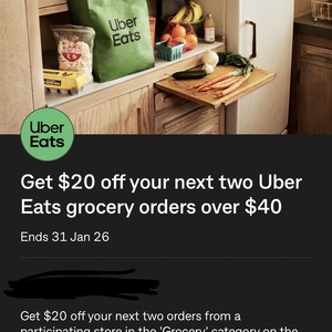 $20 off Next Two Uber Eats Grocery Order over $40 @ Commbank Yello