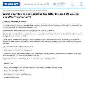 Score a sweet $30 discount at The Good Guys, just in time for Easter! You can snag this offer in-store only when you spend $250 or more. Use the unique code provided in your SMS (we can't share it here, so check your phone!) before it expires on April 8th, 2026. Don't miss out on saving big on that appliance upgrade you've been eyeing!