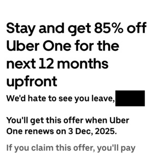 [Uber One] Cancellation Offer: 85% off 1 Year Uber One Subscription $17.98 @ Uber Eats
