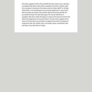 ![[Uber One] 40% off (up to $25) on 2 x Uber Black Rides @ Uber](https://jqcnnobvzfmkirjbtqeo.supabase.co/storage/v1/object/public/product-images/marquee/ozbargain/956003.jpg)