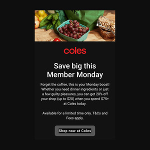 [Uber One] 20% off (up to $20) When You Spend $75 or More @ Coles via Uber Eats