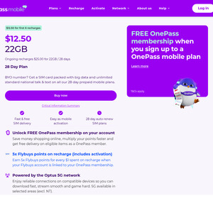 OnePass Mobile 28-Day 22GB Prepaid SIM Plan $12.50 Recharge for First 6 Recharges + Bonus OnePass Membership @ OnePassMobile