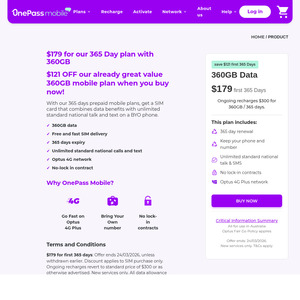OnePass Mobile 365-Day 360GB Prepaid Mobile Plan $179 Delivered (New Services Only) @ OnePass Mobile