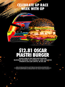 Mate, this is a cracker of a deal if you're a Grill'd fan! You can grab the awesome Oscar Piastri Burger for just $12.81, but you'll need to be a Grill'd Relish Member to use the coupon you can see in your account now. Don't miss out on treating yourself for less!