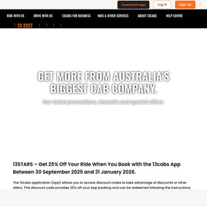 Deal: 25% off Ride @ 13cabs (Max $25). Price: $25 AUD. Available at: 13cabs.com.au. Location: Australia. Details: Need a lift without breaking the bank? You can snag a sweet **25% off your next 13cabs ride**, up to a $25 saving! Just punch in the code **13STARS** when you book. Best part? This code is valid for u. Source: WhatsCheap Australia (whatscheap.com.au)