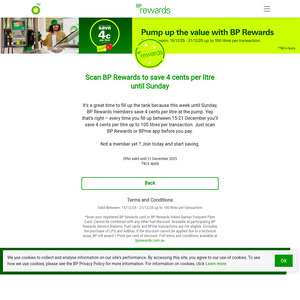 Until Sunday, you can slash 4 cents per litre off your BP fuel bill (up to 100L per fill) just by scanning your BP Rewards card or app at the pump. That’s right, you're getting real savings across the tank from December 15th to 21st—don't miss out on this easy win before it ends!