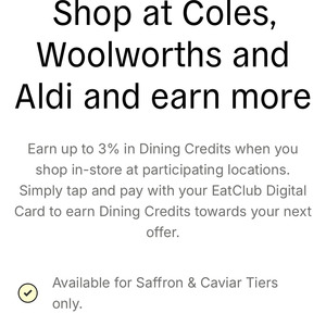 Want to get paid to do your weekly grocery shop? For a limited time, if you’re on the EatClub Caviar tier, you can earn 3% back in Dining Credit just for shopping at ALDI, Coles, or Woolworths in-store—that’s up to $10 back every month!