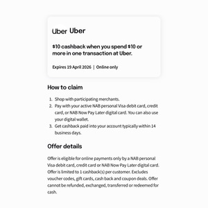 Spend $10 or More at Uber, Get $10 Cash Back @ NAB Goodies