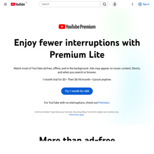 [SUBS] YouTube Premium Lite - Now includes *Background Play and *Downloads (Previously not included) $8.99 per month @ YouTube