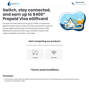 Switch & Stay 45 Days for Bonus Prepaid Mastercard: Electricity $100, Gas $150, Internet $150 @ Econnex (Excl NT, Ergon Q)