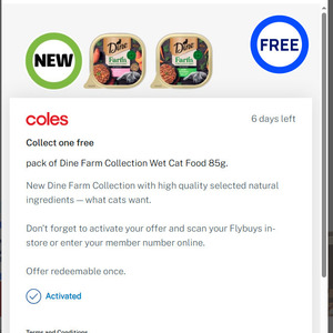 ![[Targeted] Collect 1 Free Pack of Dine Farm Collection Wet Cat Food 85g at Coles (Activation Required) @ Flybuys](https://jqcnnobvzfmkirjbtqeo.supabase.co/storage/v1/object/public/product-images/marquee/ozbargain/932770.jpg)