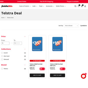Telstra Pre-Paid SIM: 6-month 70GB at $155 (RRP $180) and 12-month 165GB at $295 (RRP $350) + $4.99 shipping @MobileSkin
