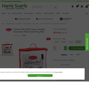 Tontine 500 GSM Heavy Weight Australian Wool Quilt King Size $69.99 + Delivery ($0 in-Store/ C&C/ $100 Order) @ Harris Scarfe