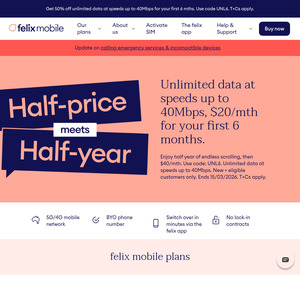 Mate, you need to see this unreal mobile deal from Felix Mobile! For the next six months, you can snag unlimited 5G data (capped at a speedy 40Mbps) for half price—that’s only $20/month!