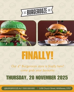 Get ready for an epic freebie run in Whittlesea! Burgerooze is celebrating their new store by treating you to a FREE Burger AND a FREE Pot of Beer—but you have to be quick! This amazing dine-in offer is only valid for one hour only on Thursday, 20 November, between 4:00 pm and 5:00 pm. Don't miss out on this perfect after-work snack and ale!