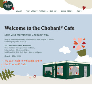 Treat yourself to a delicious freebie in the heart of Melbourne! Swing by the Chobani Cafe on Little Collins Street between 13 April and 2 May 2026 to grab a complimentary custom brekky bowl or a Greek yogurt pot.
