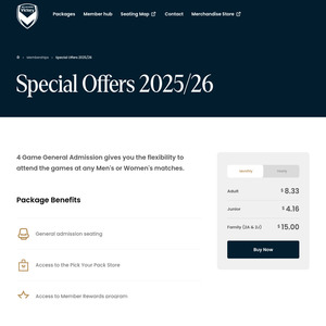 Score massive savings on A-League action with this Melbourne Victory membership deal! You're getting 4 home games for just $100 (RRP $153) – that's seriously cheaper than buying tickets separately, especially if you want to see the big names like Juan Mata.