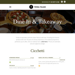 Check out the menu here: https://tondaitalian.com/dine-in-takeaway/