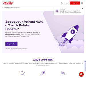 40% Discount When Purchasing between 50,000 and 250,000 Velocity Points @ Velocity Frequent Flyer