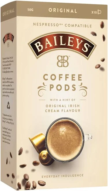 Indulge in a delicious cup of Baileys coffee with these Baileys NC Original Coffee Pods. Each pod contains freshly ground roasted coffee beans infused with the signature Baileys Irish cream flavor and just a hint of alcohol (0.01%) for an everyday treat. Simply pop one of these 10 coffee capsules into your compatible Nespresso machine and enjoy a rich, creamy coffee with notes of whiskey and vanilla. The Baileys flavor provides a smooth finish that compliments the full-bodied espresso perfectly. Sip this coffee morning or night for a sweet yet sophisticated pick-me-up. With its rich taste and smooth finish, this Baileys coffee is sure to become your new go-to pod. Experience the blend of coffeehouse flavor and Irish cream liqueur that only Baileys can deliver. The manufacturer's part number for this product is 200526.