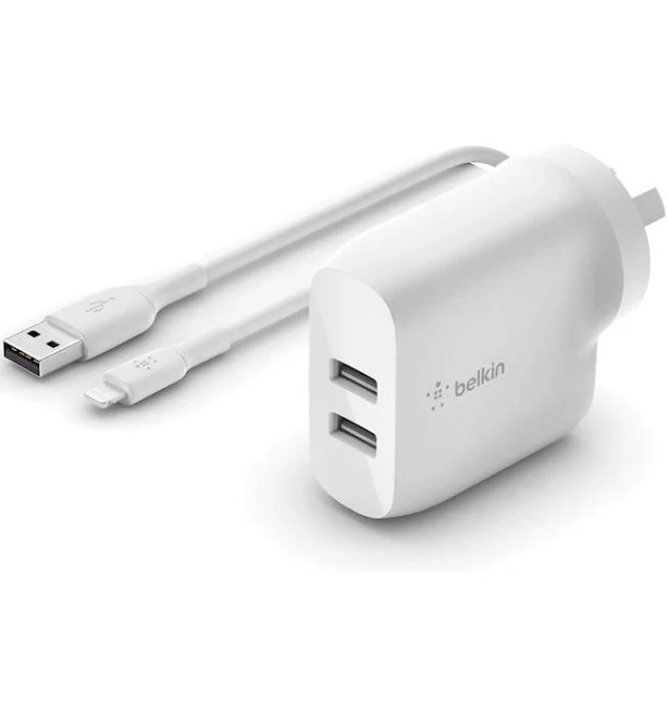 Belkin BoostUp Charge 24W Dual USB-A Charger + Lightning to USB-A Cable (White)