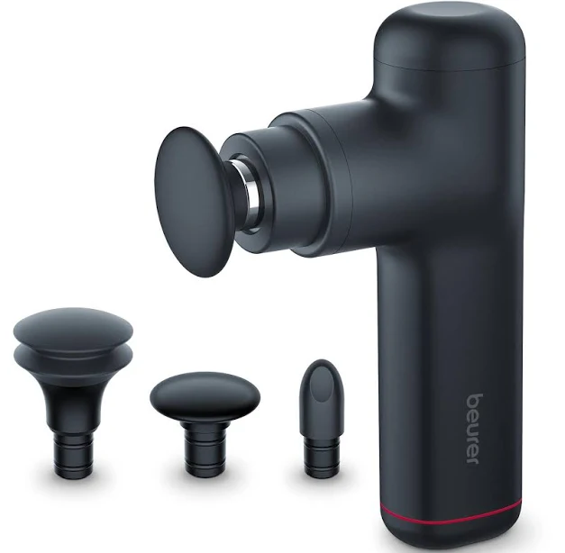 This small and lightweight massage gun makes self-application easy. Designed for gentle trigger point massage of all muscle areas, it’s also suitable for sensitive areas such as the neck, feet, and jaw muscles. It has 3 different massage attachments and 3 intensity levels ranging from approx. 1,700 rpm to approx. 2,300 rpm for comfortable use. The rechargeable lithium-ion battery is ready in just 1.5 hours and offers plenty of power to last for up to 3 hours of use. With a practical storage bag, it’s great to take with you on holiday for to the gym for a post-workout session. Wipe clean only. 95% Plastic, 5% Metal.