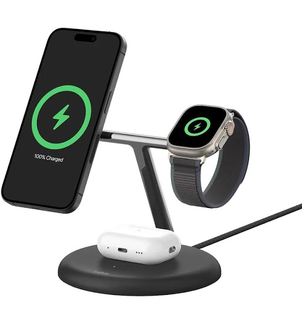 This next generation of our popular 3-in-1 stand features Qi2 compatibility, adjustable tilt for the magnetic iPhone pad, and a smaller base. Get up to 2x faster wireless charging to your iPhone 15/14/13/12, 5W to your Apple Watch and 5W to your AirPods. Leveraging magnetic Qi2 technology, the secure, aligned connection optimizes energy usage and safeguards your device’s battery life.