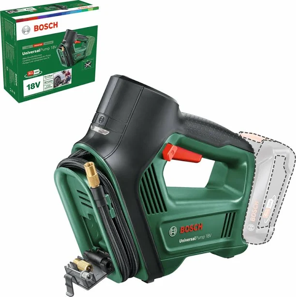 Compact, battery powered and easy to use, the 18v UniversalPump from Bosch makes short work of inflating tyres on cars and bikes, as well as sports balls, beach inflatables and numerous outdoor accessories. It comes with a 67cm hose and a set of adaptors, all of which can be stored neatly on the tool in between uses. The long hose means that users don't have to crouch down while using the pump and can operate it from a comfortable standing position, while the airflow of up to 30 litres per minute ensures that even larger inflatables can be pumped up in rapid time. Using the UniversalPump after dark is no problem as it features an integrated LED light as well as an lluminated manometer which makes it easy to see what you're doing in all conditions. The UniversalPump is part of the Power For All Alliance, and shares battery compatibility with a wide variety of 18v Home and Garden tools from Bosch, as well as products from several other manufacturers.