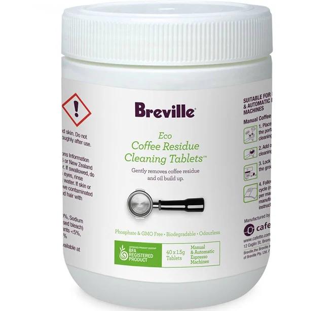 Don't let a dirty machine ruin the taste of your coffee. Keeping your espresso machines clean is easier than ever with the Breville Eco Coffee Residue Cleaner. This handy kit helps to remove hard coffee residue and oil build up from inside your coffee machine, reducing the risk of ingesting harmful bacteria and bad tastes. The Breville Eco Coffee Cleaner Kit includes 40 x 1.5g tablets, suitable for 40 doses to thoroughly clean your machine. Completely odourless, phosphate and GMO free, and biodegradable, the Breville Eco Coffee Residue Cleaner is a must-have accessory for coffee lovers.