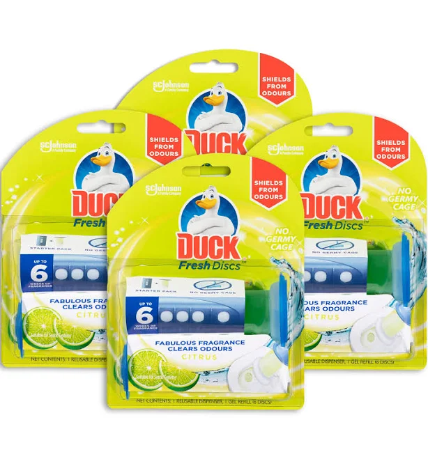 Duck Fresh Discs Toilet Bowl Cleaner, Citrus Scent, Reusable Dispenser and 1 x Gel Refill with 6 Toilet Discs, 36mL Tube (Pack of 4)