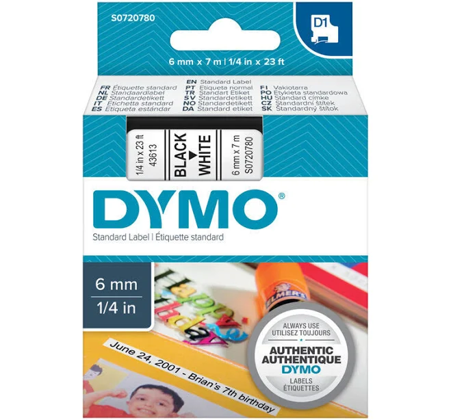 Dymo 43613 D1 Labelling Tape 6mmx7m (Black On White)