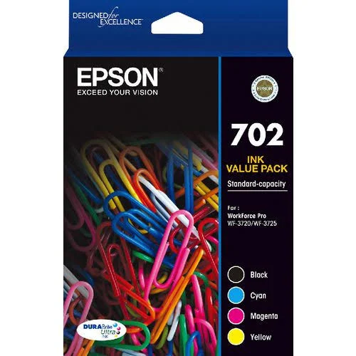 Forget about constantly running out of ink. The Epson 702 4 Colour DURABrite Ink Pack provides you with a convenient value pack of ink cartridges to keep your Epson WF-3720 or WF-3725 printer fully stocked. This multi-colour ink set includes enough ink to print up to 350 pages in black and up to 300 pages in cyan, magenta and yellow. The DURABrite ink formula delivers laser-quality text that is smudge, fade and water resistant, ensuring all your documents and photos retain their vivid colour and crisp detail. With this ink pack, you can print lab-quality photos, laser-sharp text and vivid graphics without interruption. Epson's advanced Micro Piezo printhead technology and ultrachrome DURABrite inks work together to deliver outstanding results on plain and photo paper. For exceptional print quality you can rely on, choose the Epson 702 Ink Pack. The manufacturer's part number for this product is T344692. Replenish your printer's ink supply today.