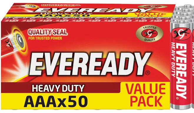 Power up your devices with long-lasting energy. These non-rechargeable batteries deliver dependable performance when you need it most. With 50 AAA batteries in each pack, you'll have plenty of power on hand for toys, flashlights, remotes and more. The Eveready name means trusted quality. Enjoy hours of uninterrupted playtime and usage with batteries designed to last. From power-hungry devices to low-drain ones, these heavy duty AAAs offer an affordable solution. The compact AAA size fits conveniently into any device that requires it. Avoid the frustration of unexpected battery failure with Eveready's reliable construction and leak-resistant design. Give your gadgets the consistent power they crave. The manufacturer's part number for this product is E301515500. Invest in long-lasting energy today.