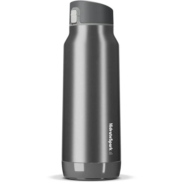 Meet HidrateSpark PRO. the world's smartest water bottle ever created. With a new stainless steel insulated construction. customizable glow colours and patterns. rechargeable battery and chug drinking lid. the HidrateSpark PRO makes drinking more water as easy as blink. drink. sync. The LED smart sensor puck? glows to remind you when its time to drink and tracks your water intake by syncing via Bluetooth to the FREE HidrateSpark App. keeping your daily goal updated as you go. Key Features BPA-free. vacuum-insulated stainless-steel bottle. keeps drinks cold up to 24 hours and prevents sweating LED smart sensor puck glows to remind you when its time to drink and tracks your water intake by syncing via Bluetooth to the FREE HidrateSpark app. App is available for iOS and Android devices Design includes a rechargeable battery and comes with a fast-charging cable so you never miss a beat! Lid includes a protective spout cover to keep out dirt and germs. Lid includes a button lock to avoid accidental spills A carry loop makes it easy to take on-the-go Please note Lids are top-rack dishwasher safe. Bottle bodies are hand-wash only. DO NOT submerge. wash or get the sensor wet. DO NOT use product with hot liquids.