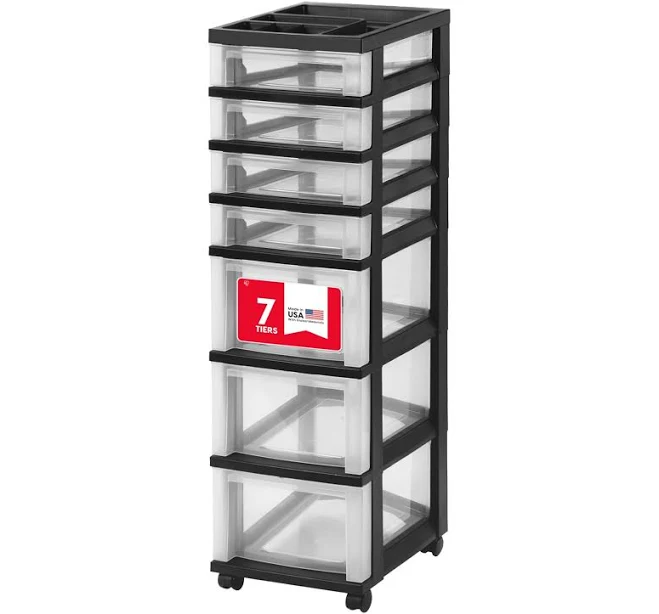 Storage Drawer Carts by Iris Ohyama. Details:Organize your office, craft room, or any space with this efficient 7-drawer rolling cart, designed to provide both convenience and style. The clear drawers make it easy to identify the contents at a glance, allowing for quick access to supplies. With removable casters, the cart is easily mobile, so you can roll it from room to room, making it an ideal storage solution for areas where you need flexibility. The top of the organizer offers additional space for small accessories, keeping them within reach and organized. Built-in drawer stops prevent the drawers from accidentally falling out when they are opened or when the cart is moved. The shallow drawers measure 14 x 12 x 3.1 inches, while the deeper drawers measure 14 x 12 x 7 inches, providing ample storage for a variety of items. Proudly made in the USA, this rolling cart combines durability, practicality, and mobility, making it a perfect addition to any space that needs extra storage.