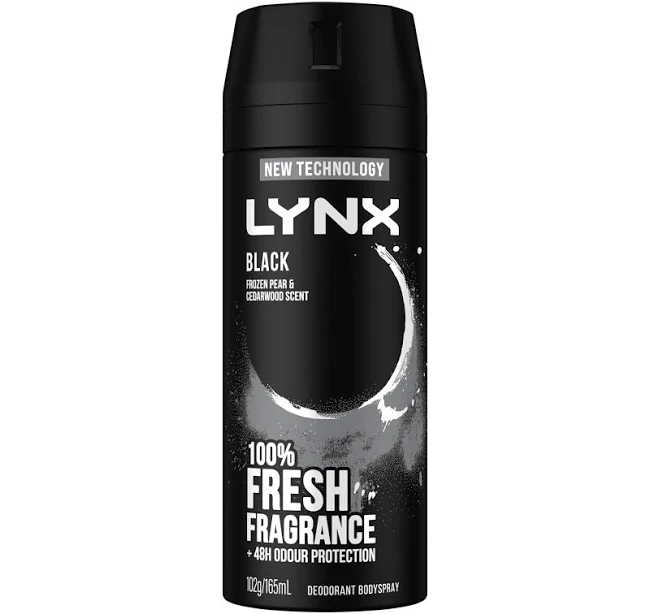 LYNX Black Body spray's subtle fragrance doesn't have to try hard. It makes its presence felt with notes of watermelon, bergamot and frozen pear. Lynx is committed to producing styling and grooming products that help guys look better, smell better and feel more confident when taking on the world.