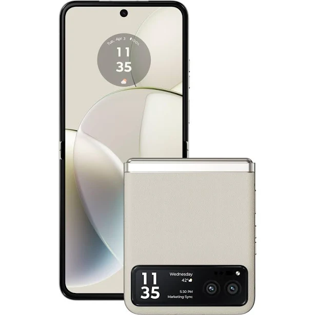 Iconic foldable design. Flip the script with a pocketable flip design in a range of fun, trendsetting colors and a leather-like finish. Capture like never before. With Flex View, stand your phone on its own at multiple angles, giving you entirely new ways to interact, capture, and create. Everyday essentials at a glance. View notifications, check the weather, snap a selfie, and more, all without having to flip open your phone. Immersive entertainment. Flip open the phone to reveal a massive 6.9" pOLED screen, combined with multidimensional Dolby Atmos and Spatial Sound. Versatile high-res cameras. Capture crystal-clear photos and selfies in any light with a 64MP main camera and OIS—or a 32MP camera with Quad Pixel technology.