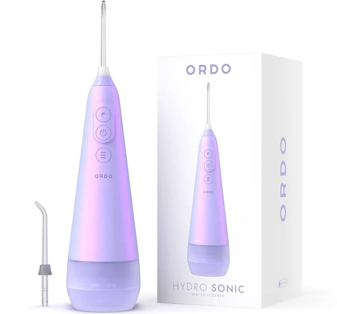 Tired of floss picks that just don't cut it? Say hello to the Ordo Hydro Sonic Water Flosser in Pearl Violet. This electric flosser uses hydro-kinetic technology to blast away plaque and food debris from your teeth and gum line, helping protect against cavities and gum disease. With three pressure modes (sensitive, daily clean, and power clean), a handy on-demand button, and a 360-degree nozzle, you can customize your flossing experience. The quad pacer timer pulses every 30 seconds to keep you on track, while the automatic shut-off ensures you don't overdo it. USB-C charging gives you 30 days of use on a single 6-hour charge. Ready to amp up your oral care game?