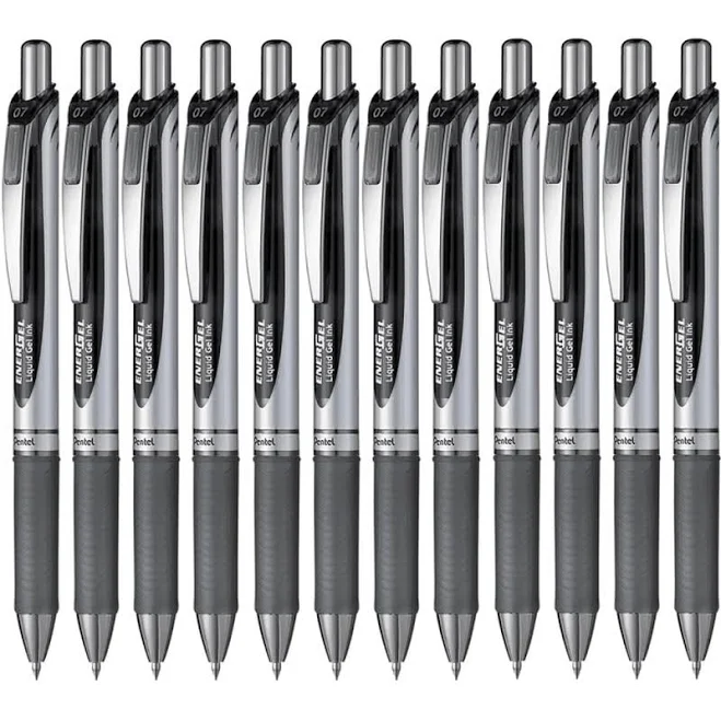 This Pentel EnerGel Xm pen features a convenient retractable design with a chunky metallic-look barrel and rubber grip for comfort in use. With revolutionary refillable liquid gel ink the EnerGel formula is quicker drying and smoother flowing than ordinary gel ink giving a similar sensation to liquid ink. The medium 0.7mm tip writes a 0.35mm line width for general use at home work or at school. This pack contains 12 black pens.
