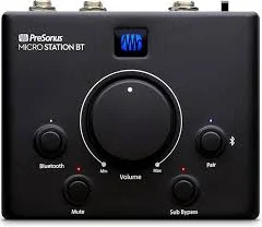 PreSonus MicroStation BT - 2.1 monitor controller with BT input and dedicated subwoofer output - MicroStation BT is the ultimate solution for anyone who wants to add Bluetooth connectivity to their favorite pair of studio or media reference monitors. A convenient Bluetooth receiver lets you wirelessly stream audio to any pair of studio or media reference monitors right from your phone. Balanced ¼” TRS inputs are provided to connect pro audio hardware, like your audio interface. A stereo ⅛” input is available to hardwire your phone or tablet when you don’t want to use Bluetooth. Ready to add a subwoofer? MicroStation BT is ideal for creating a simple 2.1 system. A convenient, large volume knob lets you control the overall level of your speakers and sub at the same time. The Sub Bypass button lets you switch back to simple stereo listening whenever you like. A headphone output and Main Mute let you silence your speakers without stopping the tunes. Compact, convenient, and stylish–with flexible connectivity and easy-to-use controls, MicroStation BT will make you wonder how you listened without it!